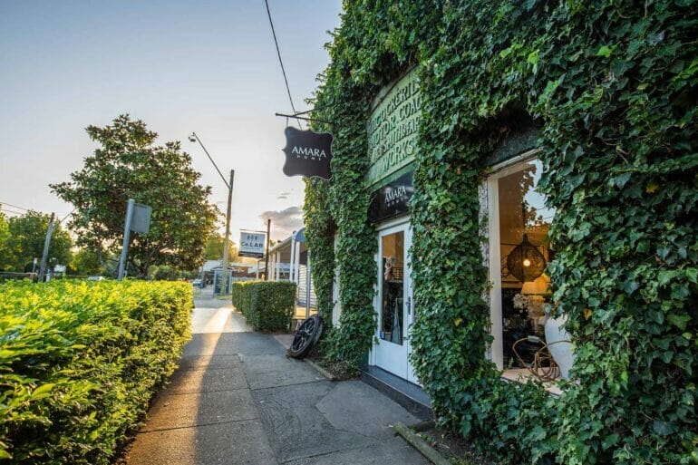 Amara Home is located in a stunning building next to Il Locale restaurant with beautiful green foliage covering the entrance of the store.