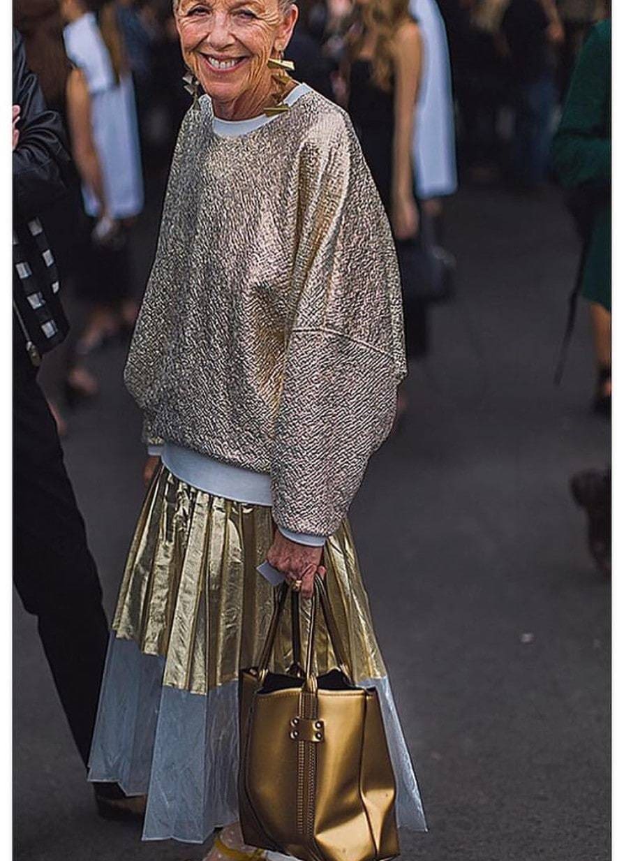 Labelled as Australia’s very own Iris Apful is Lesley Crawford. I really love this woman’s style and the mix of gold in this outfit.