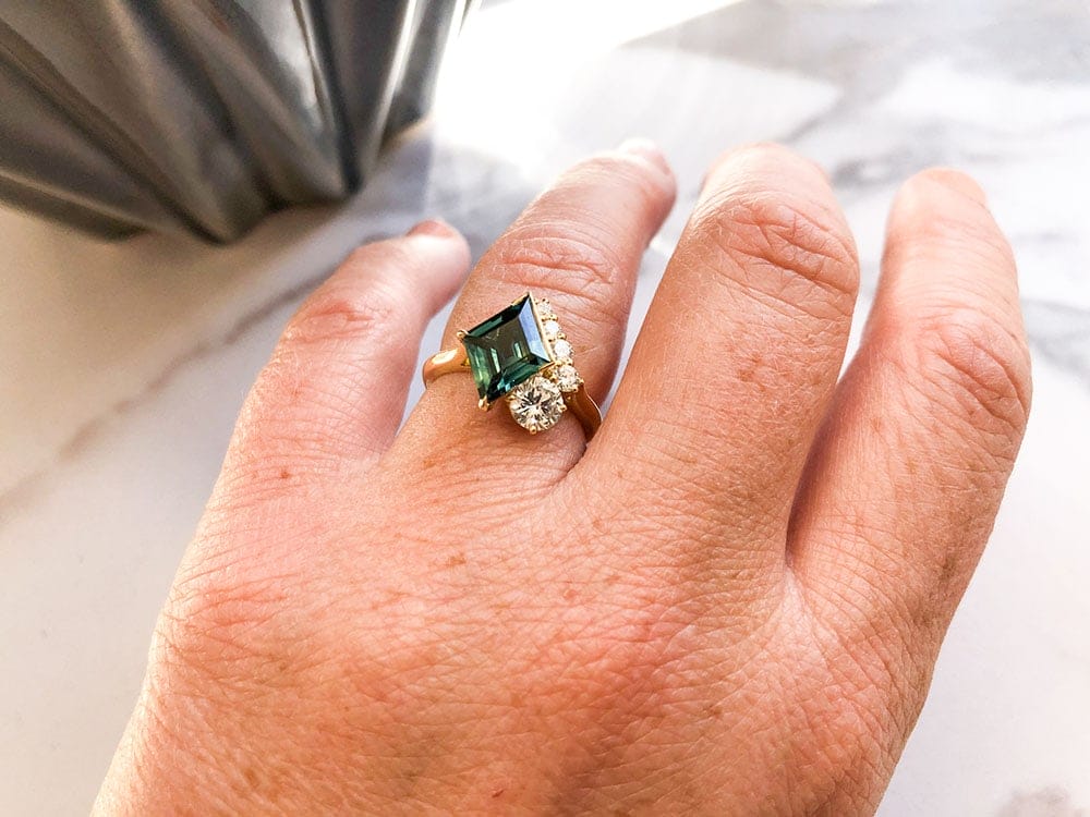 Once we found the sapphire, Sian started to sketch different designs on what would work with Steve’s mum’s diamond. I decided to go for a kite shape because I felt like it was the most flattering one on my finger. I loved how it changes colour in the light as well as the overall cut.