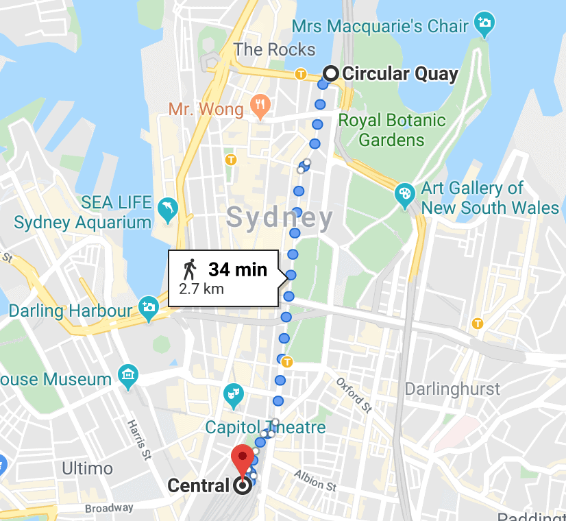 You can walk from Central Station to Circular Quay and the Opera House in 30 minutes just by walking in a straight line down one of those three streets.