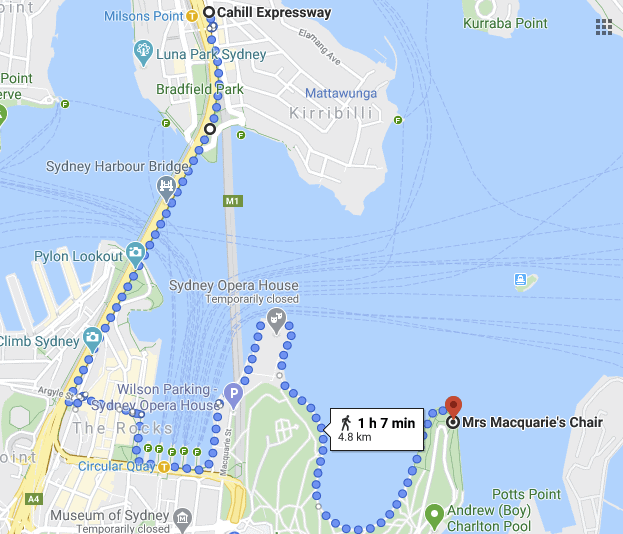 Another walk I used to do was from Kirribilli to Mrs Macquarie’s Chair. Get the train or ferry to Kirribilli, then walk back over the Sydney Harbour Bridge, down to Argyle Street and into The Rocks.