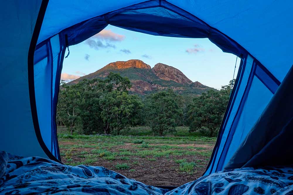 The views across to the Breadknife, Bluff Mountain and Belougery Split Rock are phenomenal. Choose your camp spot wisely to get the best view. There’s also an outdoor cinema space, just ‘cos, I suppose!