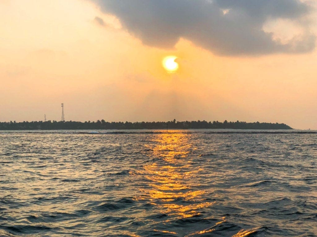 On the boat at sunrise looking back at Thoddoo whilst we went snorkeling with Manta Rays
