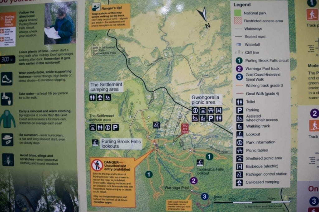 There is a sign on the other side of the car park saying Purling Brook Falls and if you walk onto the track from where the sign is, you’ll find the information about the walk hiding around the corner. There’s a Purling Brook Falls map for you to take a photo if needed, and more information about the walk before you start.