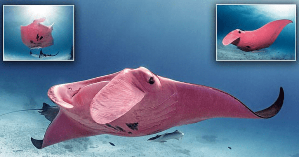 So why is his skin pink? Turns out he’s got a rare genetic mutation after scientists from the mantra ray research group called Project Manta managed to take a small skin biopsy from him.
