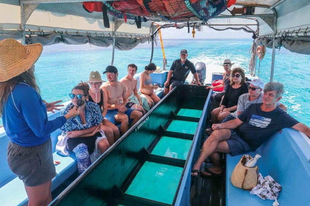As the amazing crew split us into two groups, our group headed onto the glass bottom boat tour over to the island whilst the other group went snorkelling around the lagoon.